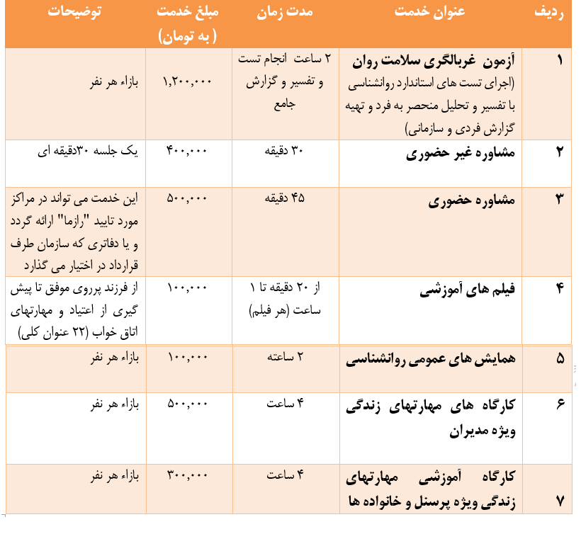 لیست خدمات تخصصی روانشناسی "رازما" ویژه پرسنل سازمانها